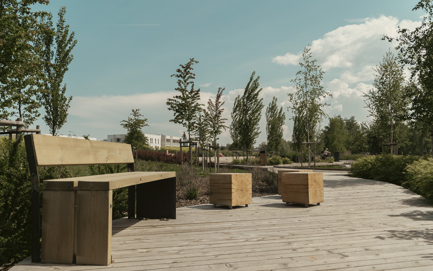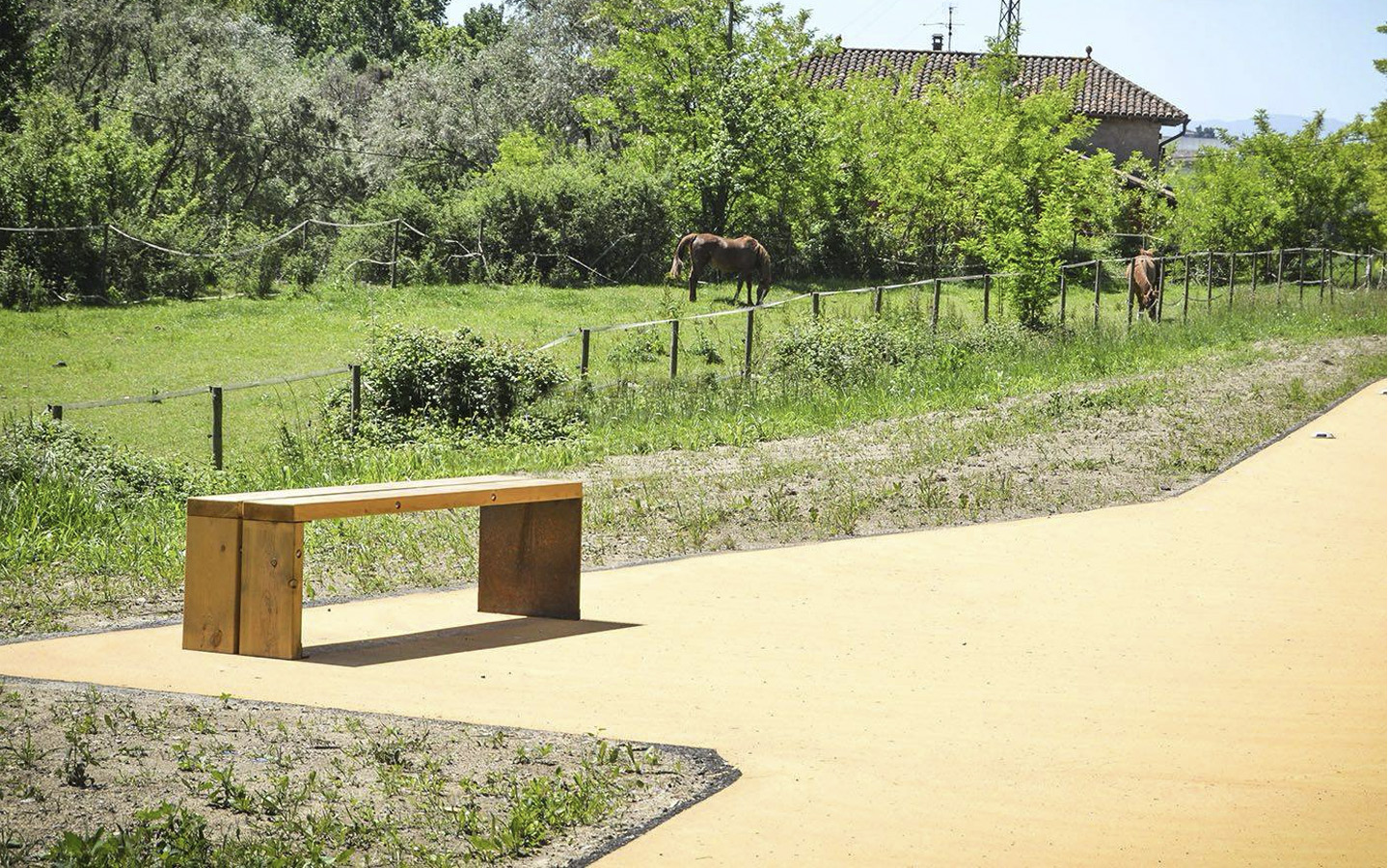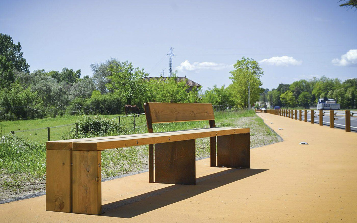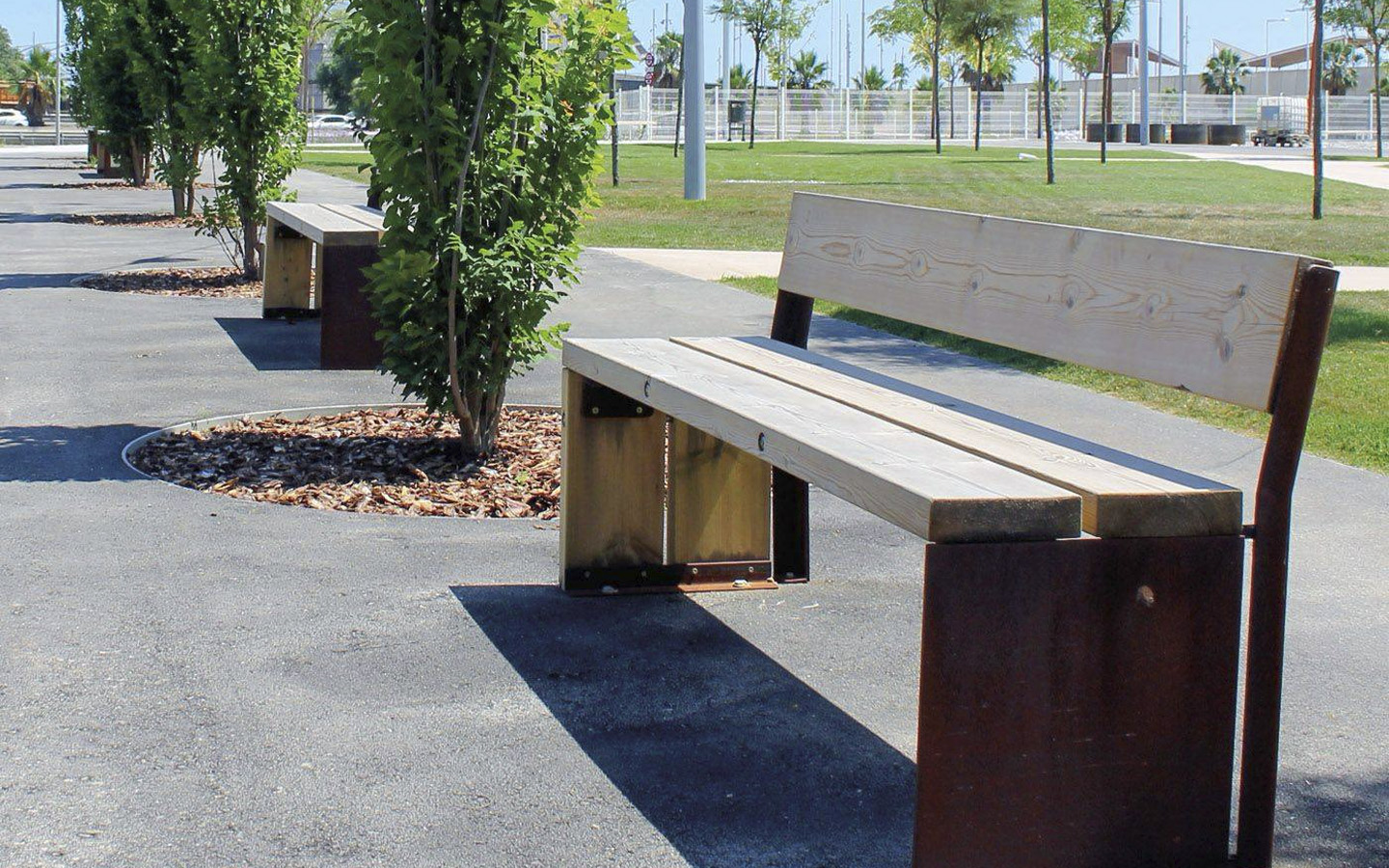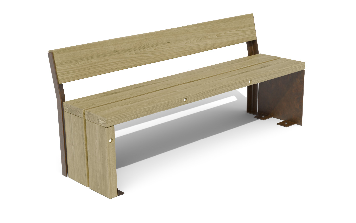 Fremstillet med ben i cortenstålplade (vedligeholdelsesfri) og planker i fyrretræ, behandlet i vakuum/tryk-autoklave (klasse 4) mod borebiller, termitter og insekter.