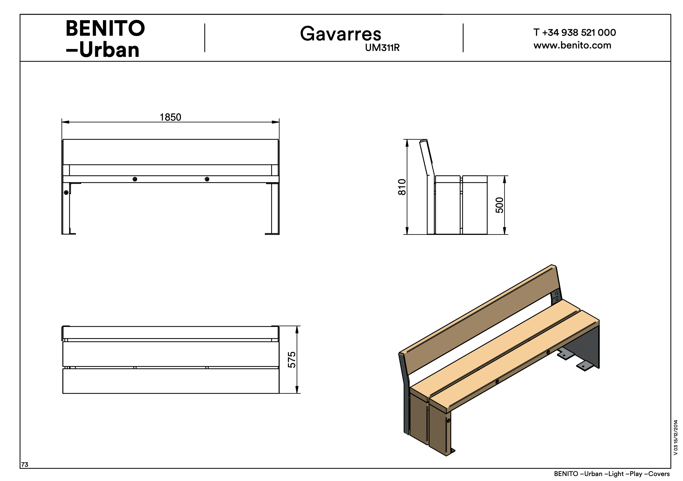 Designbænk GAVARRES fra BENITO, samlede mål (længde x højde x dybde): 1850 x 810 x 575 mm.