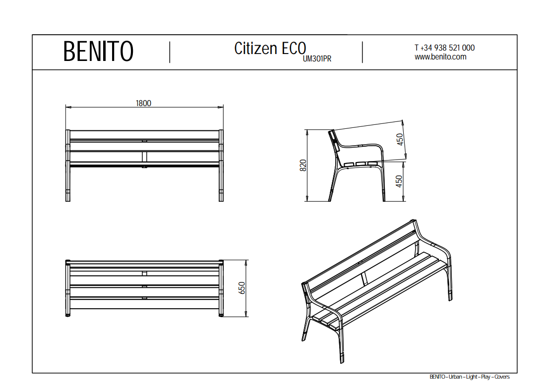 Sæde og ryglæn er lavet af 110 x 40 x 1800 mm Hårdttræ eller Rebnew-planker, stellet med armlæn er lavet af højtryksindsprøjtet polymer. Overflade i farven Marson. De vedligeholdelsesfri planker– flækker ikke, revner ikke, rådner ikke og tørrer ikke ud. Meget modstandsdygtig over for fugt og hårdt vejr.
